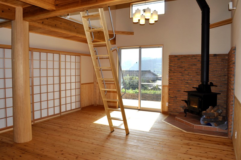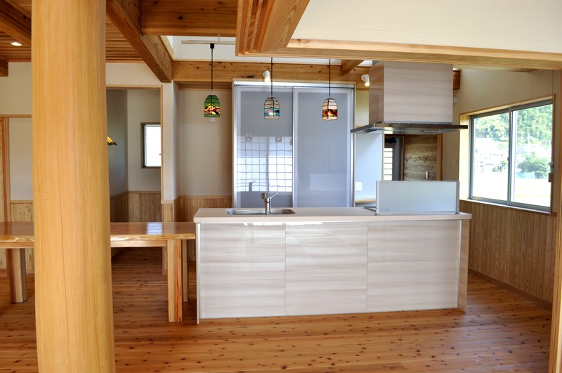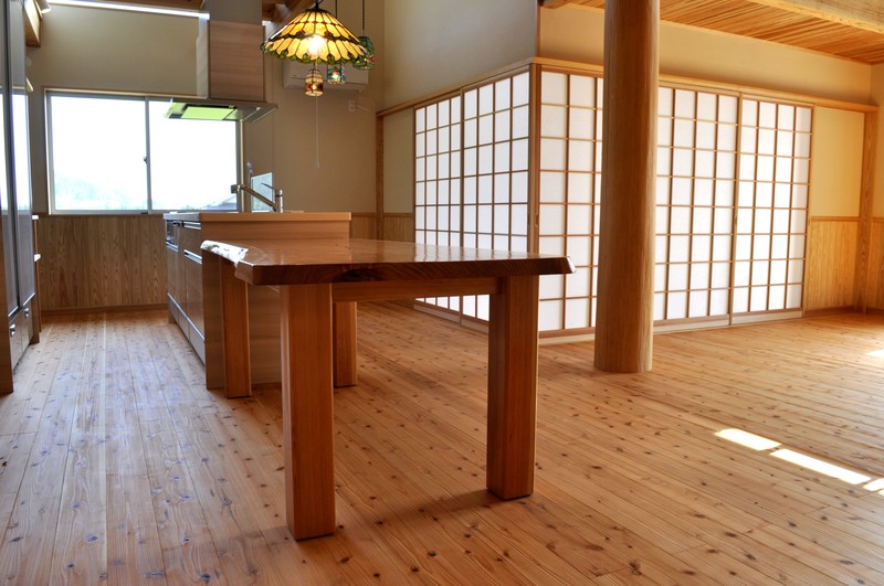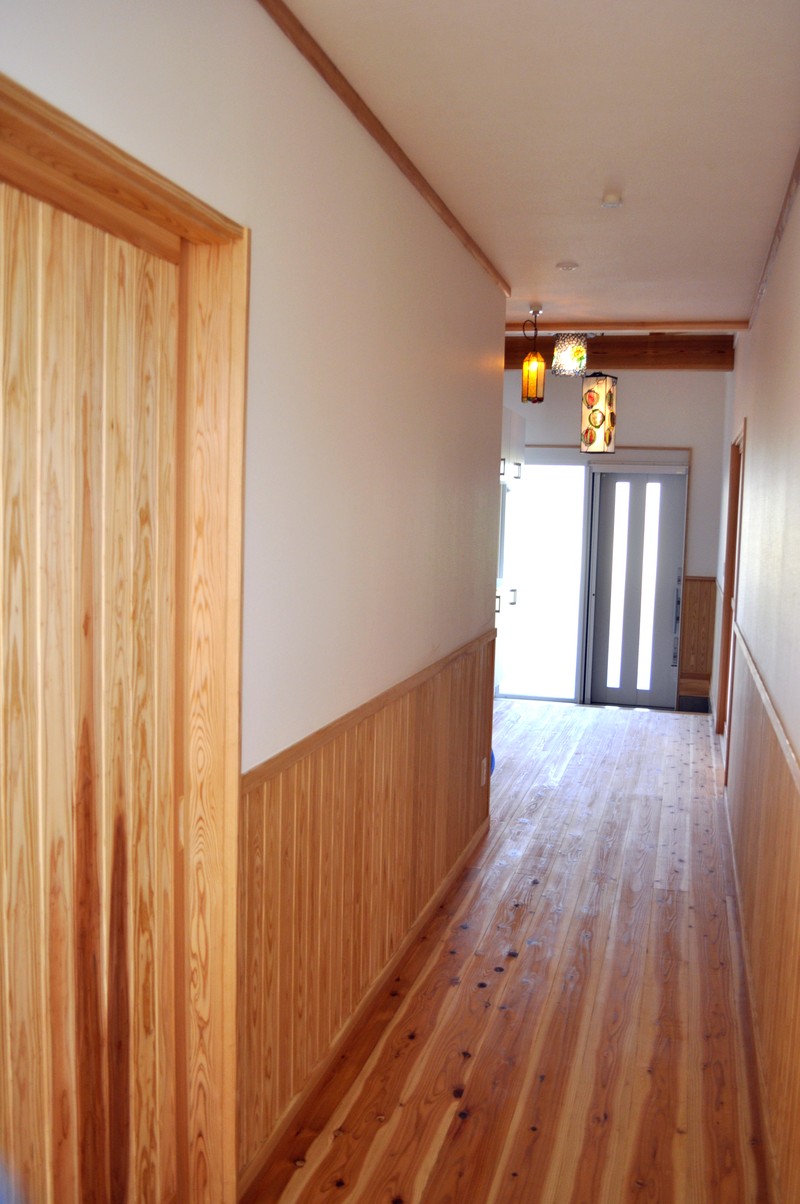 天然木と手作りの照明が迎えてくれる玄関廊下